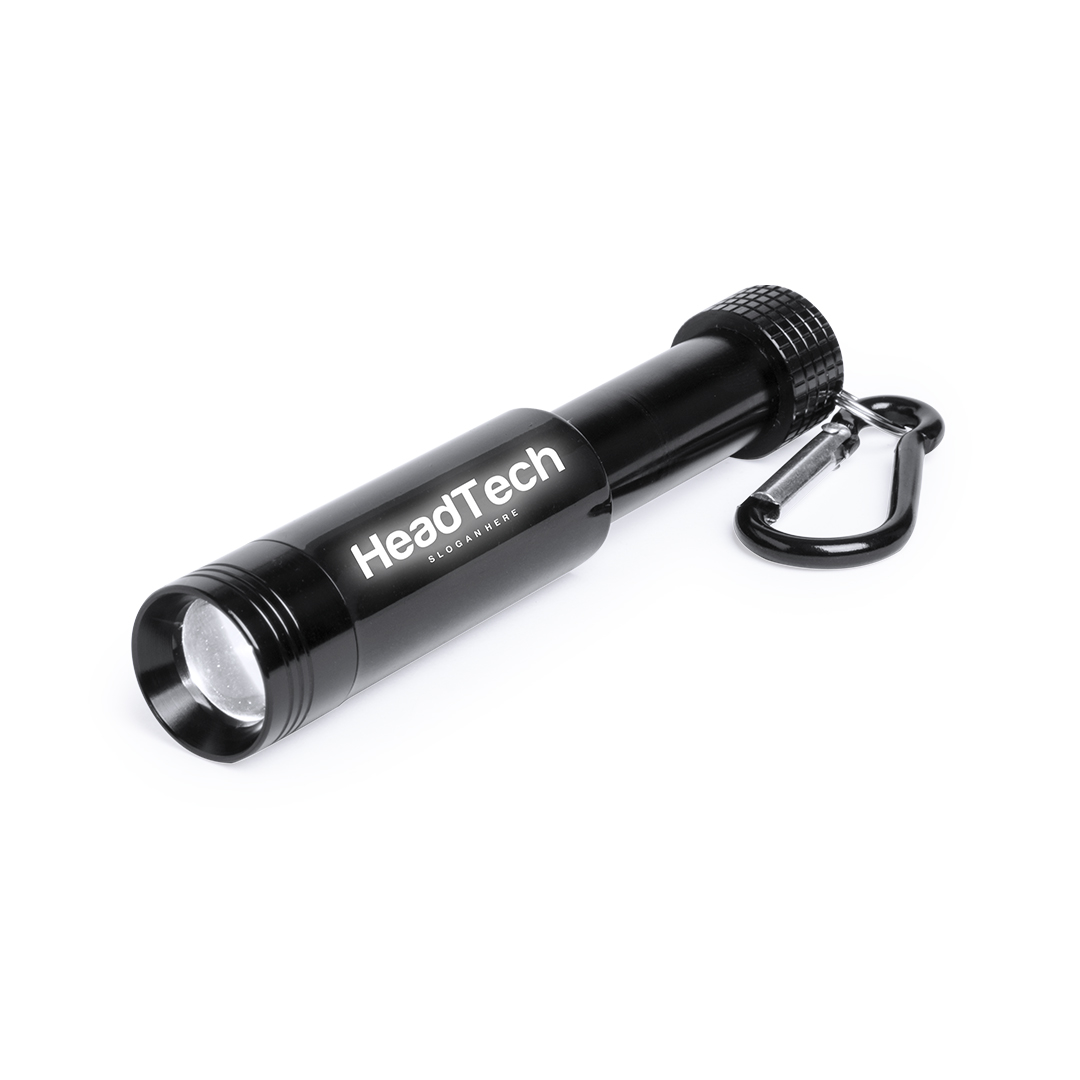 Linterna con cuerpo extensible en acabado negro metalizado. Con luz led interior y cuerpo especialmente diseñado para marcaje en láser, iluminando así el logotipo. Mosquetón de transporte a juego y alimentación a pilas -de botón incluidas-.